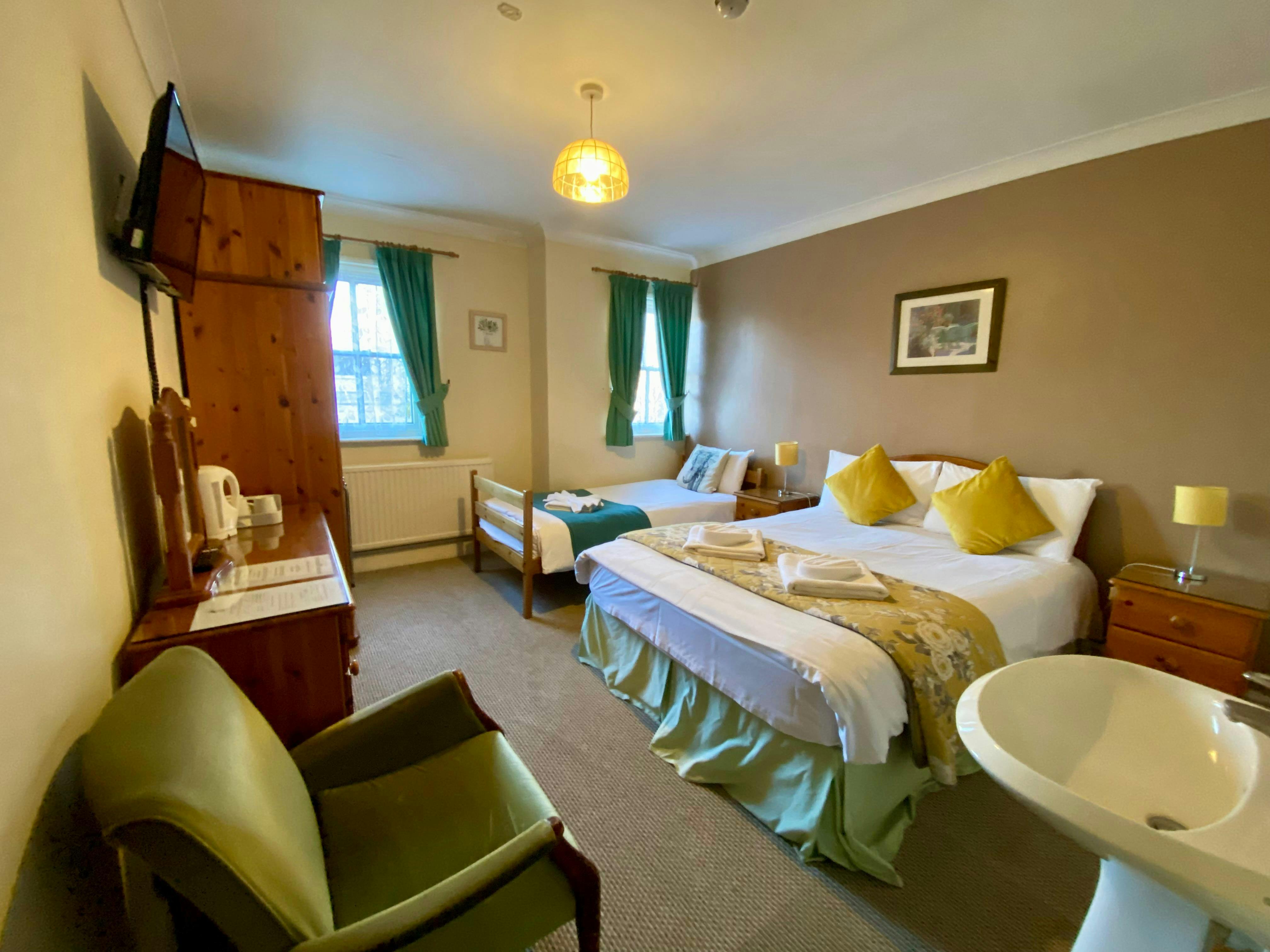 Our Standard Family Room is ideal for small families or groups of up to three guests looking for a comfortable stay in Oxford. The room features one double bed and one single bed within 183 sq ft of well-designed space.The room includes a private en-suite bathroom with a bath or shower, along with free high-speed Wi-Fi, a flat-screen TV, and tea and coffee making facilities for added convenience.